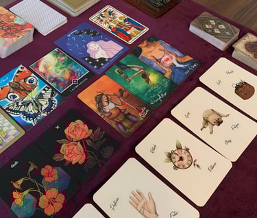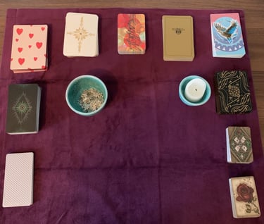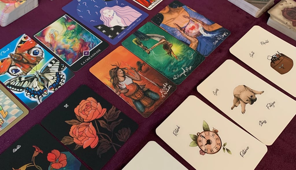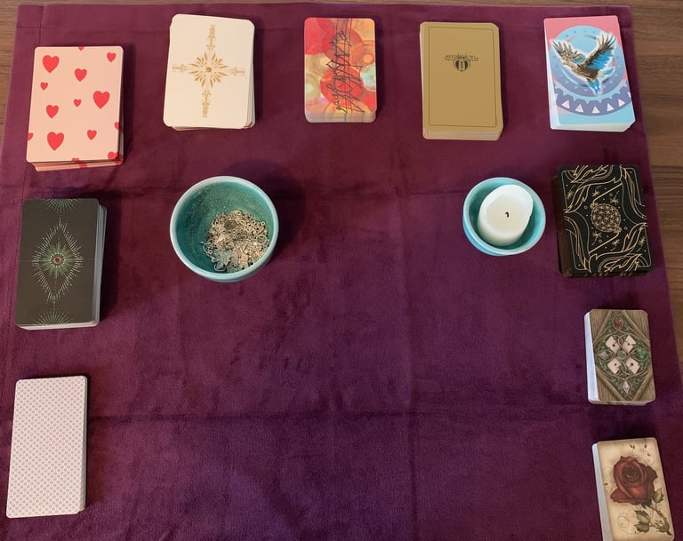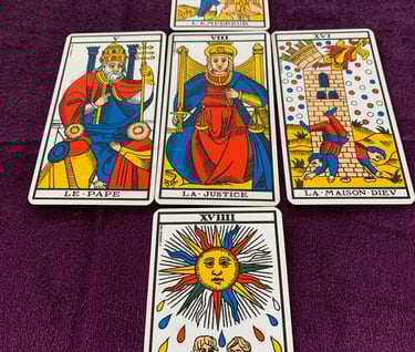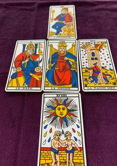 Pour mes guidances, j’utilise le tarot de Marseille, que je complète avec d’autres oracles et tarots qui me donnent des compléments et des précisions sur vos questions.